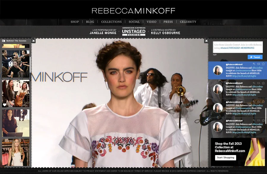 The first evolution of the UNSTAGED music program dove into the world of Fashion and brought together two icons in their own right. Rebecca Minkoff's official NYFW show was live streamed to the world and featured musical backing by pop and style icon Janelle Monae. To give viewers an up close and personal perspective on the runway looks, veteran voice Kelly Osbourne hosted and live tweeted the event.