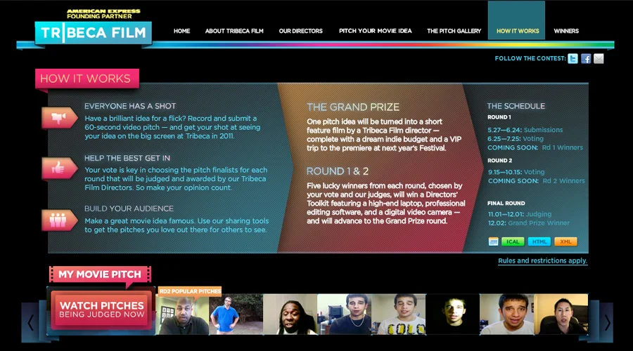 My Movie Pitch was the rare contest for both casual film fans and aspiring auteurs alike. You didn’t need to know a thing about making a film; you just needed a good idea, one that you could pitch in 60 seconds or less. The winner, as decided by a special Tribeca jury and the votes of online users, would get the perfect movie ending — having their story made into a film by an acclaimed indie director, premiering at the Tribeca Film Festival.