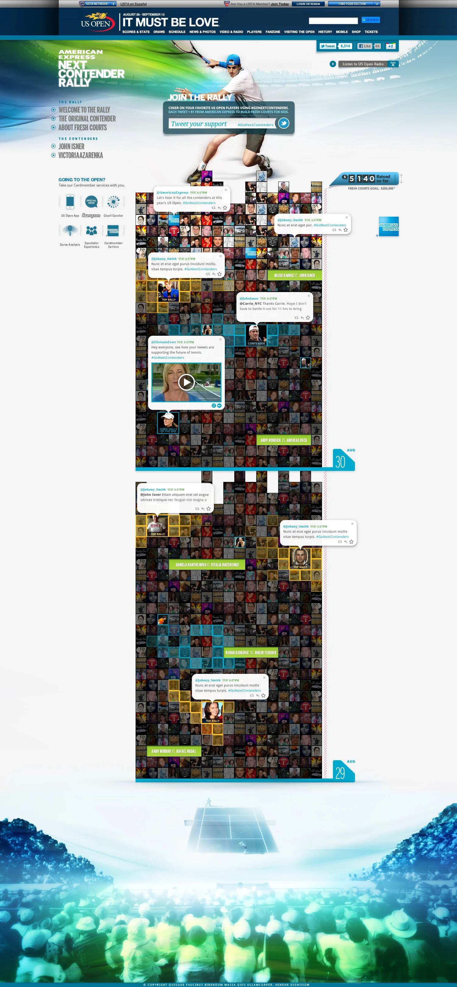 We created a responsive website that visualized social participation while creating a system for content organization and navigation. As the days went on and the tweet support came in, users could scroll down and see highlight moments and tweets from other fans and tennis notables.
