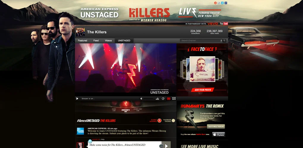 For the live experience The Killers and Herzog asked the global audience to submit photos of themselves holding signs that marked their hometowns. Fans from around the world were featured onstage throughout the concert.