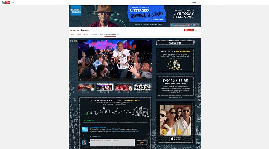 With UNSTAGED, American Express created a revolutionary digital music experience — bringing together breakthrough music artists, legendary directors, high quality 1080 HD streaming, and an unprecedented level of connectivity between artist and fan. From choosing the cameras, to voting on song performances, to impacting the stage experience through socially-enabled creativity, millions of music fans could now “be there, together” from anywhere.